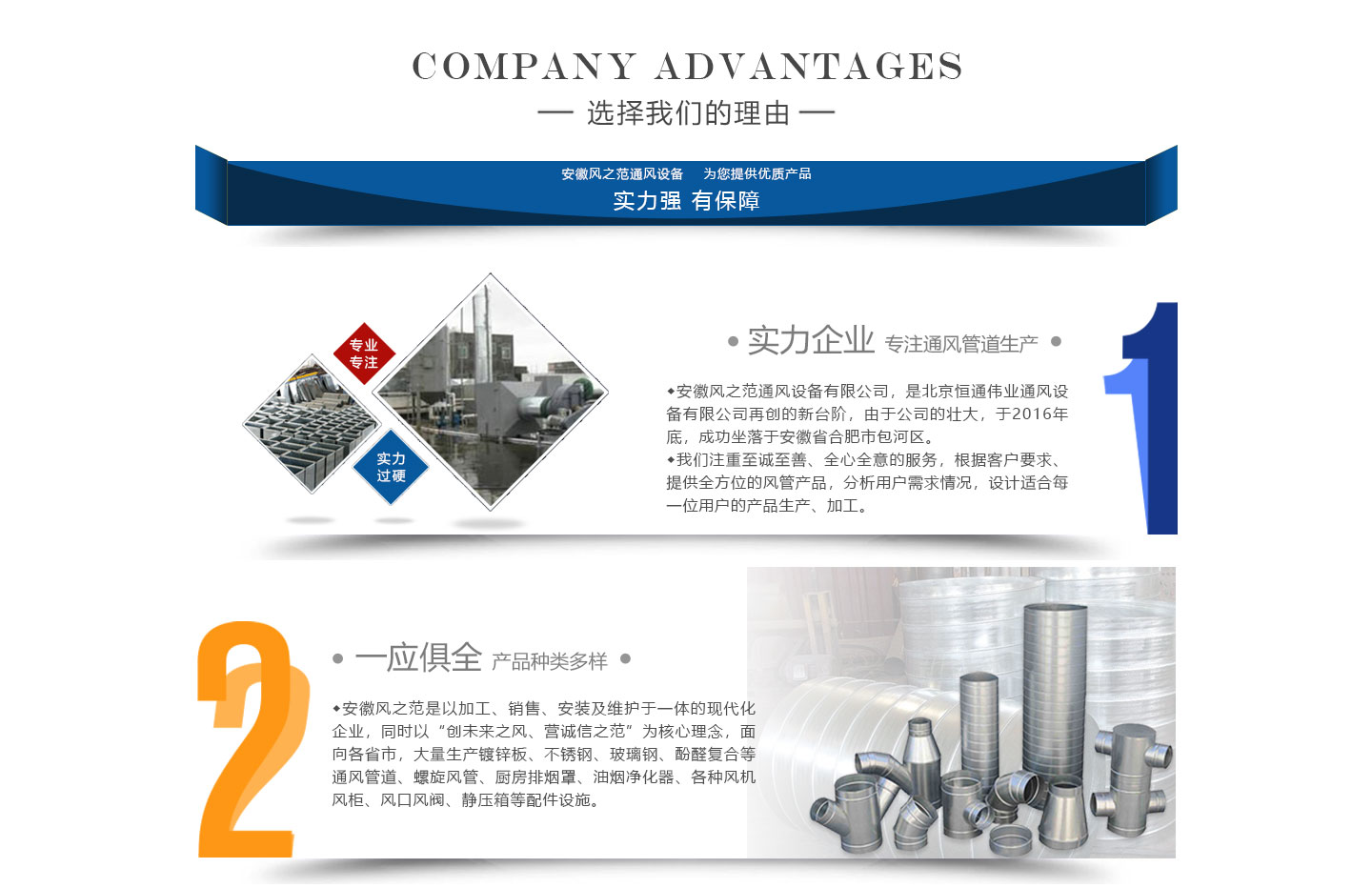 安徽風之范通風設(shè)備有限公司,是北京恒通偉業(yè)通風設(shè)備有限公司再創(chuàng)的新臺階,多年來,公司員工憑著“誠信敬業(yè)、團結(jié)拼搏、勇于開拓、務(wù)實進取”的企業(yè)精神,先后承接了多項重點工程項目,使公司健康穩(wěn)步發(fā)展。現(xiàn)由于公司的壯大,業(yè)務(wù)的拓展,又于2016年底,成功坐落于安徽省合肥市包河區(qū)。本公司生產(chǎn)設(shè)備精良,技術(shù)力量雄厚,質(zhì)保體系完善!讓用戶體驗到,貼心的服務(wù),無憂的售后!風之范是以加工、銷售、安裝及維護于一體的現(xiàn)代化企業(yè),同時以“創(chuàng)未來之風、營誠信之范”為核心理念,面向全國各省市,大量生產(chǎn)鍍鋅板、不銹鋼、玻璃鋼、酚醛復(fù)合等通風管道、螺旋風管、廚房排煙罩、油煙凈化器、各種風機風柜、風口風閥、靜壓箱等配件設(shè)施。廣泛承接商場、工廠、酒店、寫字樓、地下室等,消防排煙工程、除塵凈化工程、室內(nèi)通風工程、暖通空調(diào)工程、廚房排煙凈化工程。我們力求上進,追求,歡迎各界人士技術(shù)指導,經(jīng)濟合作,共創(chuàng)美好明天!